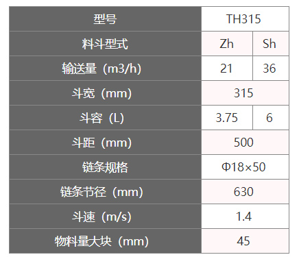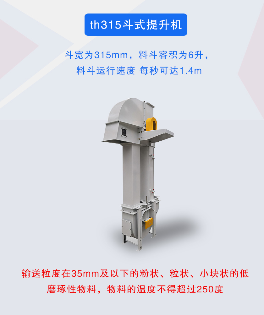 th315斗式提升機斗寬為315mm,料斗容積為6升,斗速1.4米/秒,適合輸送粉末狀,顆粒狀及小塊狀物料,th315斗式提升機輸送量為60立方/時,可選用碳鋼或不銹鋼材質(zhì).