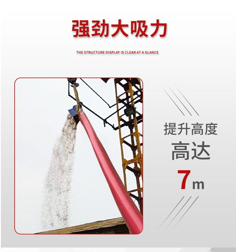 車載吸糧機一般主要由進料口、牛津管、無軸螺旋、出料口、機座、電機(汽柴油機、蝸輪減速機)等部分組成。當物料均勻適量地由進料口進入牛津管后,電機(汽柴油機)通過皮帶輪帶動螺旋片旋轉,螺旋將物料輸送至機箱一端的出料口,然后落入車廂、倉庫、尼龍袋等物料接收處。效率可達每小時25噸,提升高度8米。水平距離為6-30米工作時軟管彎曲半徑不得小于一米。