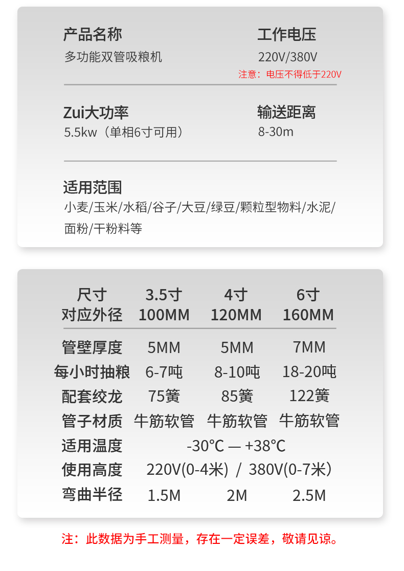 機器7m以下可使用3kw兩相/3KW三相銅線電機,8m-12m之間可使用4kw三相電銅線電機,一般情況下,220V垂直高度3米,380V垂直高度4米(數據一般以糧食為準)