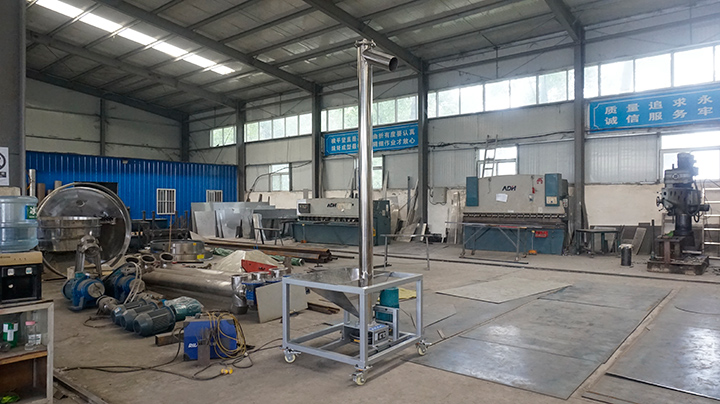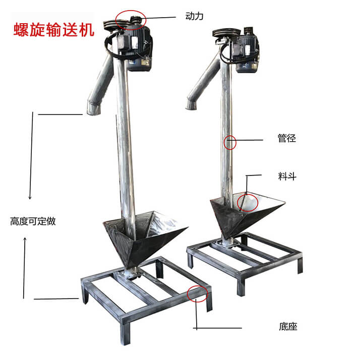 垂直螺旋輸送機由水平進料螺旋和垂直螺旋組成,從料倉或料斗或從上游進料裝置進料,保證進料有足夠的倉壓,確保物料能順利地向上輸送,垂直提升高度可達8米。